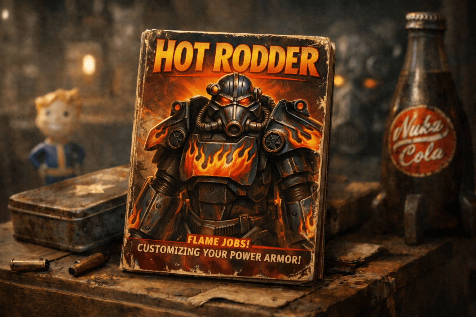 Hot Rodder is a collectible magazine series in Fallout 4 that unlocks unique custom paint jobs for Power Armour. Each issue allows you to apply a different Hot Rod–themed paint scheme, giving your Power Armour a distinctive flame-covered look inspired by classic pre-war automotive culture.